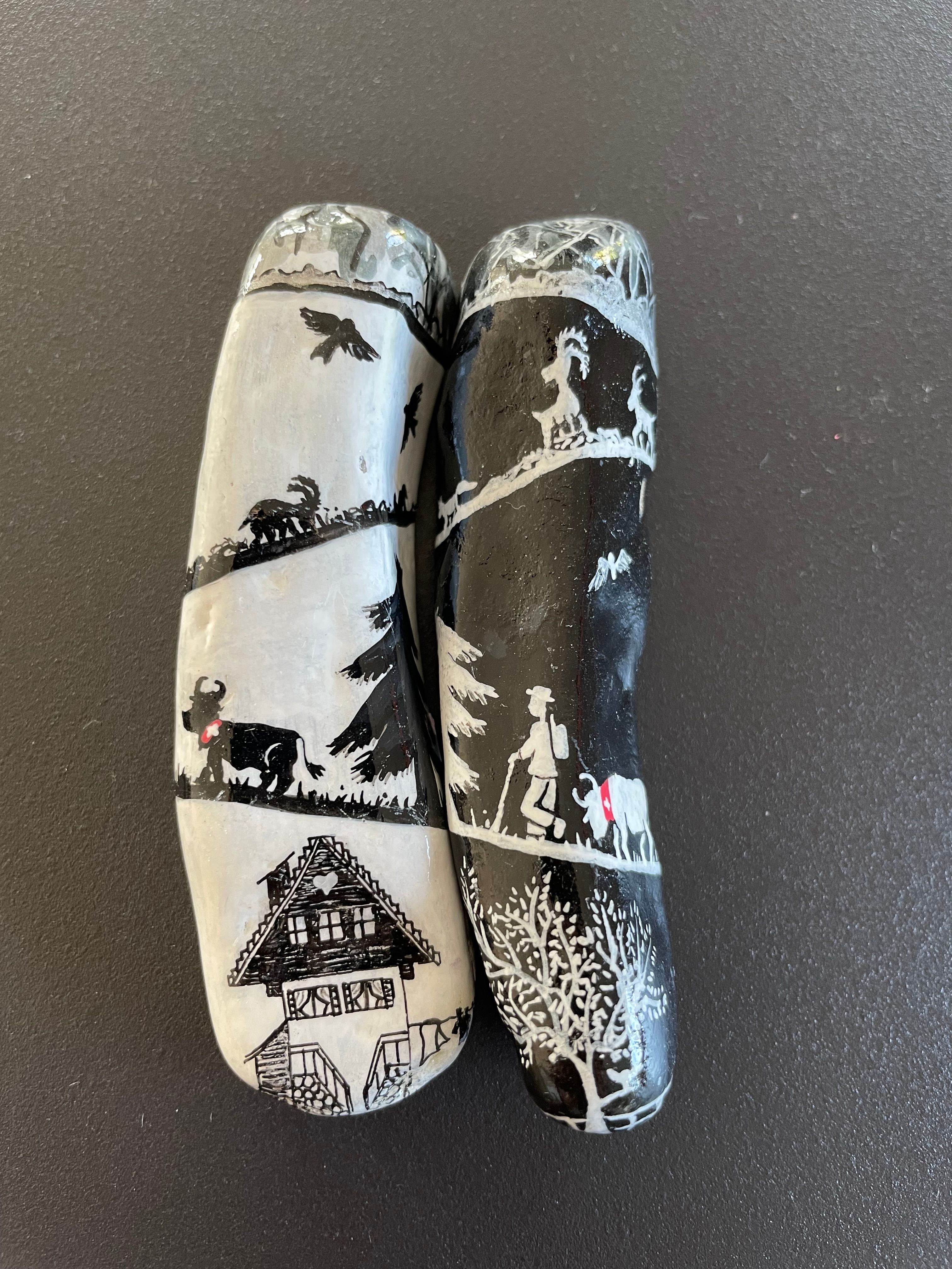 Peinture sur verre, protégée d'une deuxième plaque de verre. Cadre en vieux bois entièrement fabriqué à la main. Système leds intégré sans câble apparent. Certains possèdent des éléments insolites, une cachette secrète ou une phrase cachée.