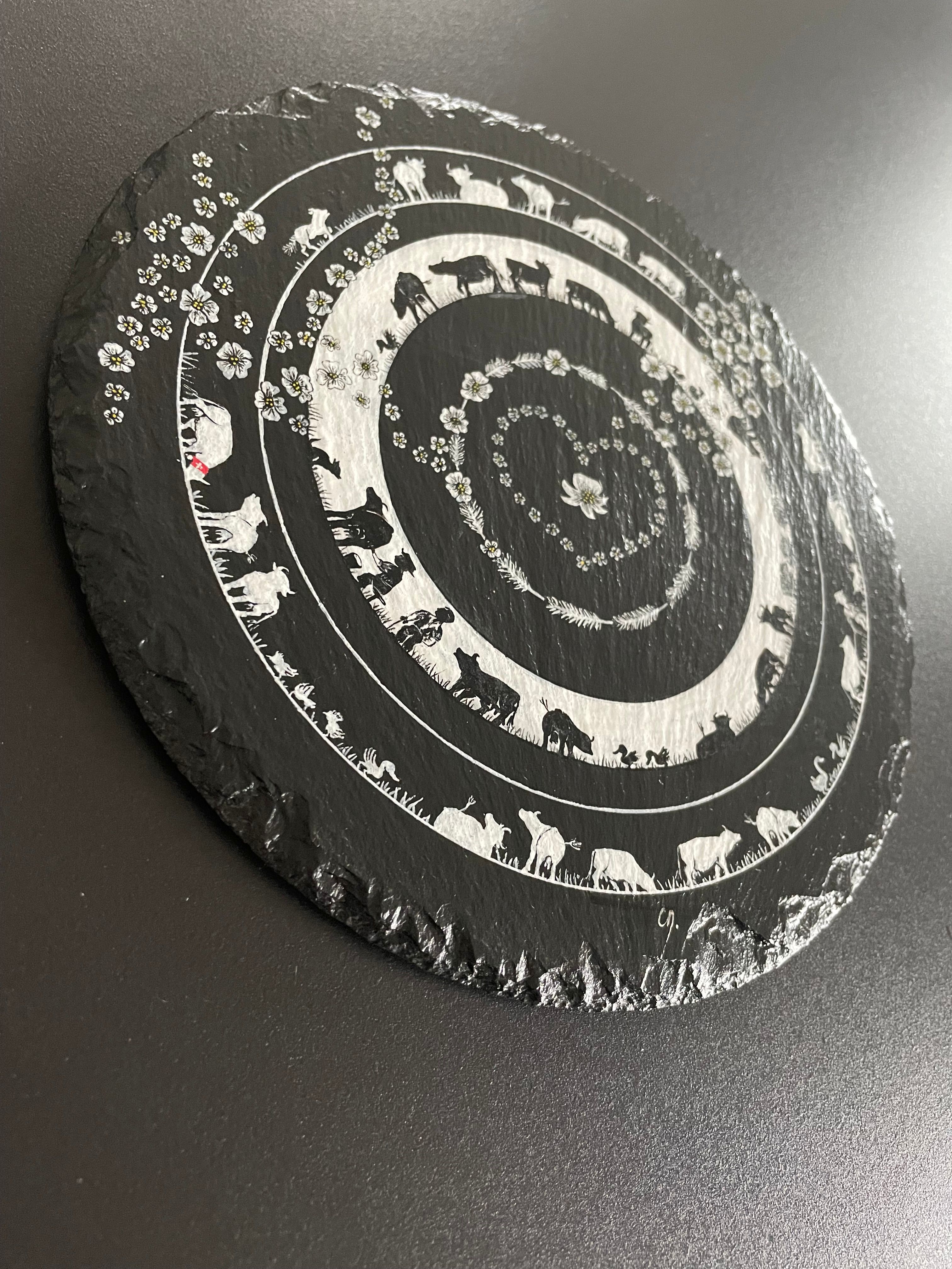 Ardoise peinte à la main et vernie. Supportant la chaleur, elles sont compatibles avec les aliments et se nettoient à l'eau savonneuse. Commande et personnalisation (anniversaire, retraite, mariage...) possible sur demande.