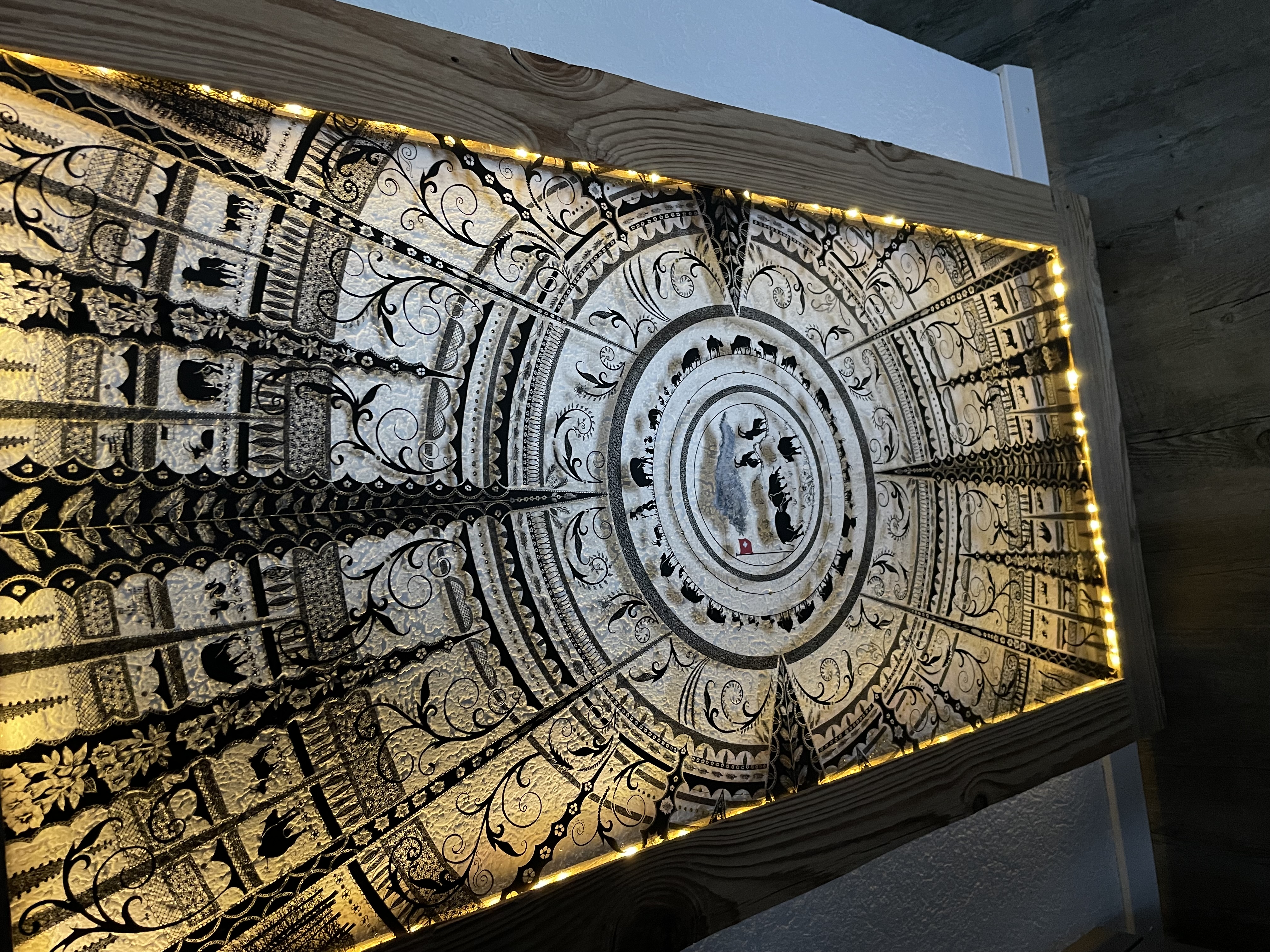 Peinture sur verre, protégée d'une deuxième plaque de verre. Cadre en vieux bois entièrement fabriqué à la main. Système leds intégré sans câble apparent. Certains possèdent des éléments insolites, une cachette secrète ou une phrase cachée.